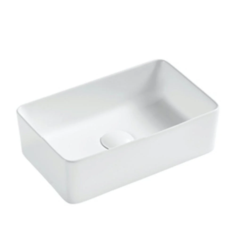 Lavabo De Sobre Encimera de la serie QTRO de Aquore. Fabricado en porcelana blanca brillo de alta calidad. Sin rebosadero. De forma rectangular con cantos finos y esquinas redondeadas.