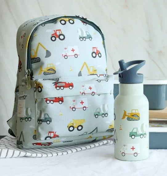 Botella de acero inoxidable apta para aguantar tanto bebidas frías como calientes. Tiene una pajita para que sea fácil poder beber de ella. El estampado de camiones de construcción le encantará a los más pequeños.
