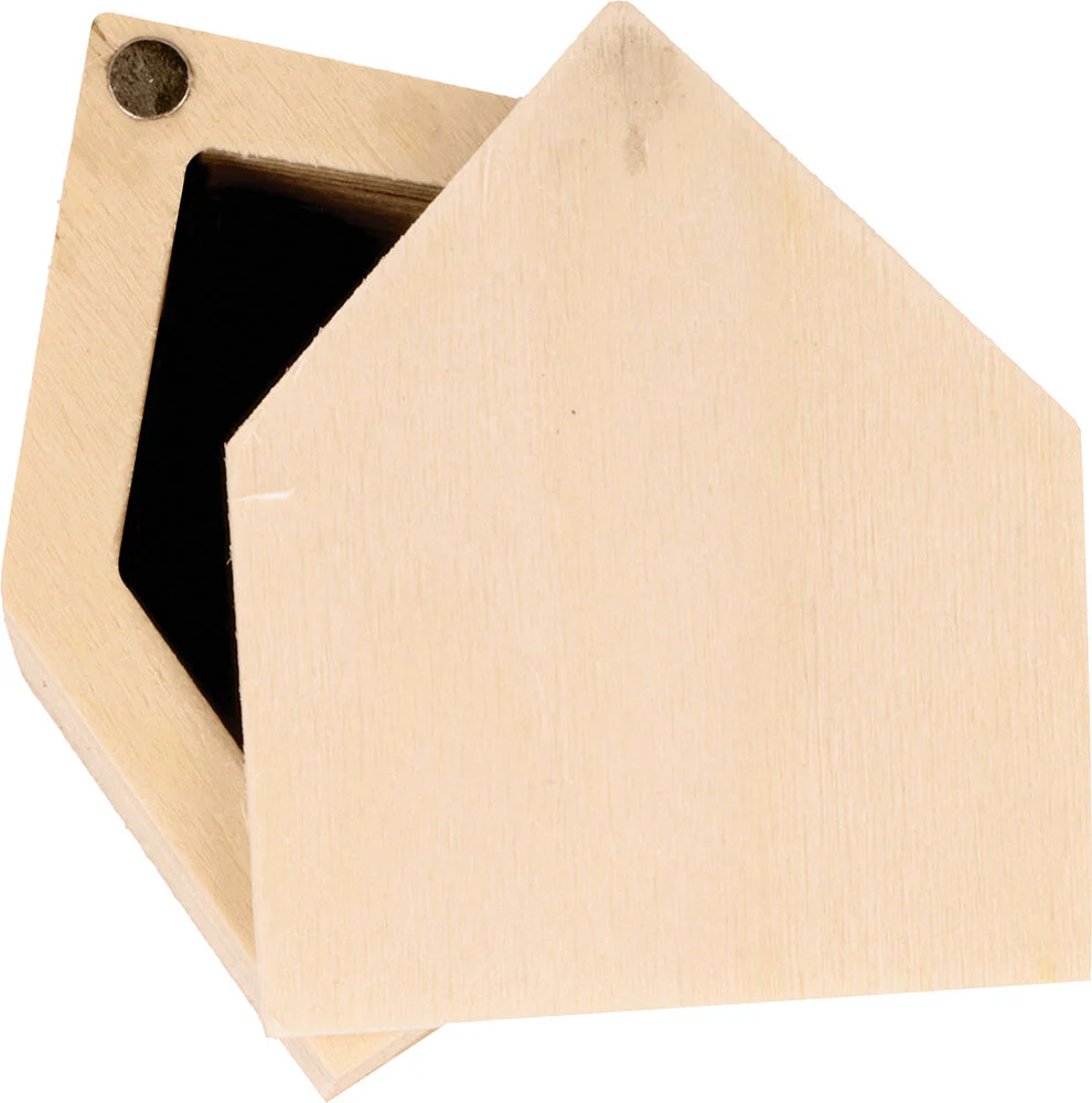 Tiene 24 cajones, 21 cajones tienen forma de casa con unas dimensiones de 5x6x5,5 cm, las casas se cierran gracias a un imán.