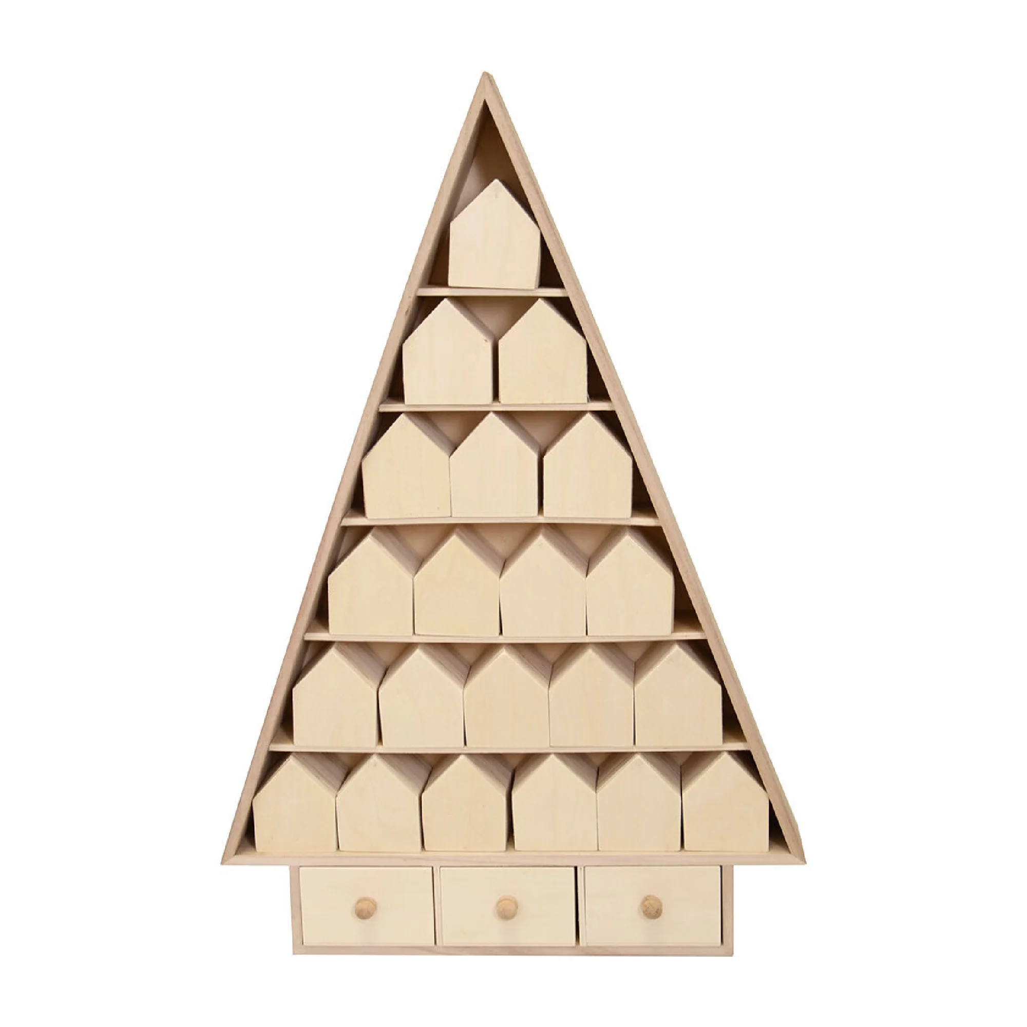 Calendario de adviento de madera de gran diseño en forma de árbol.