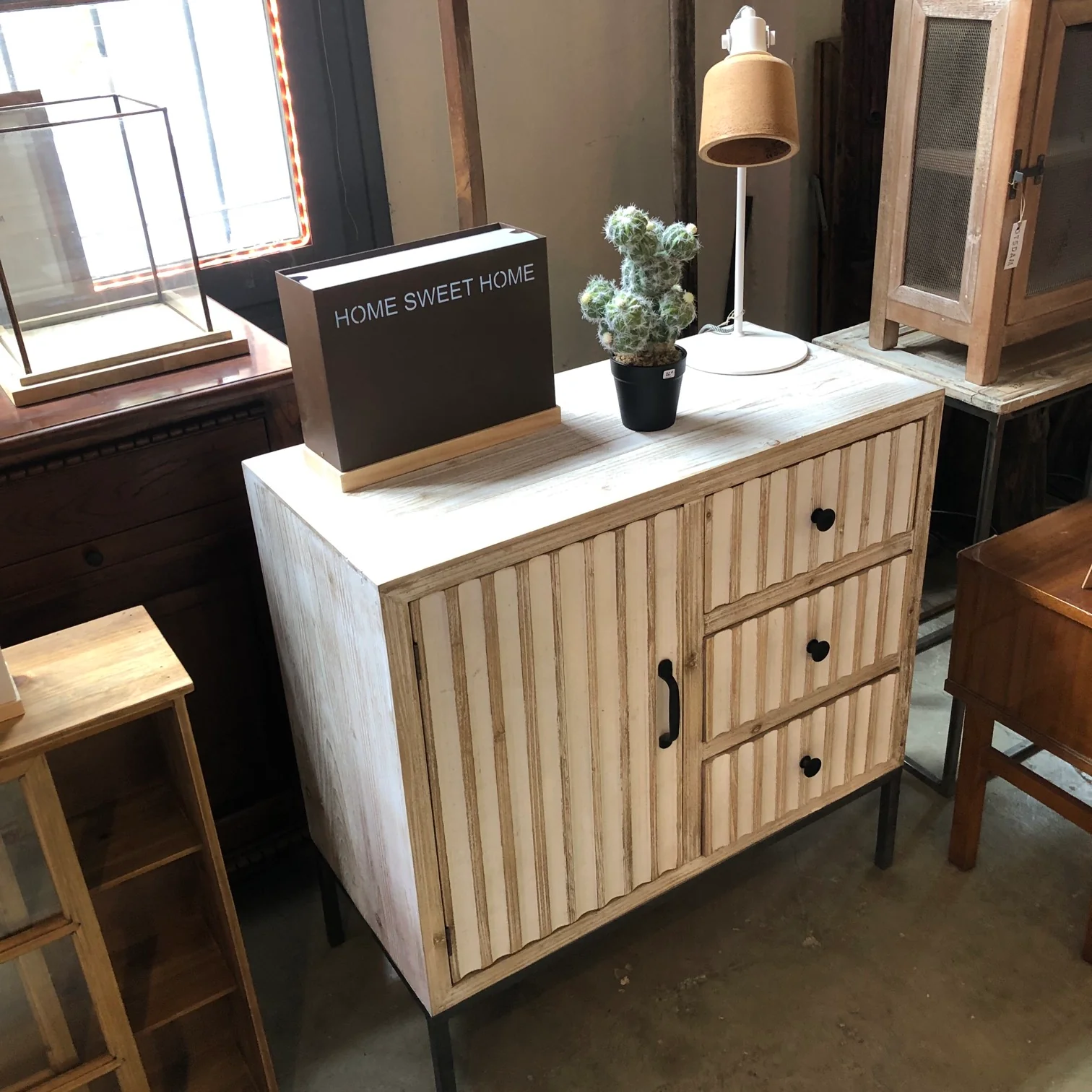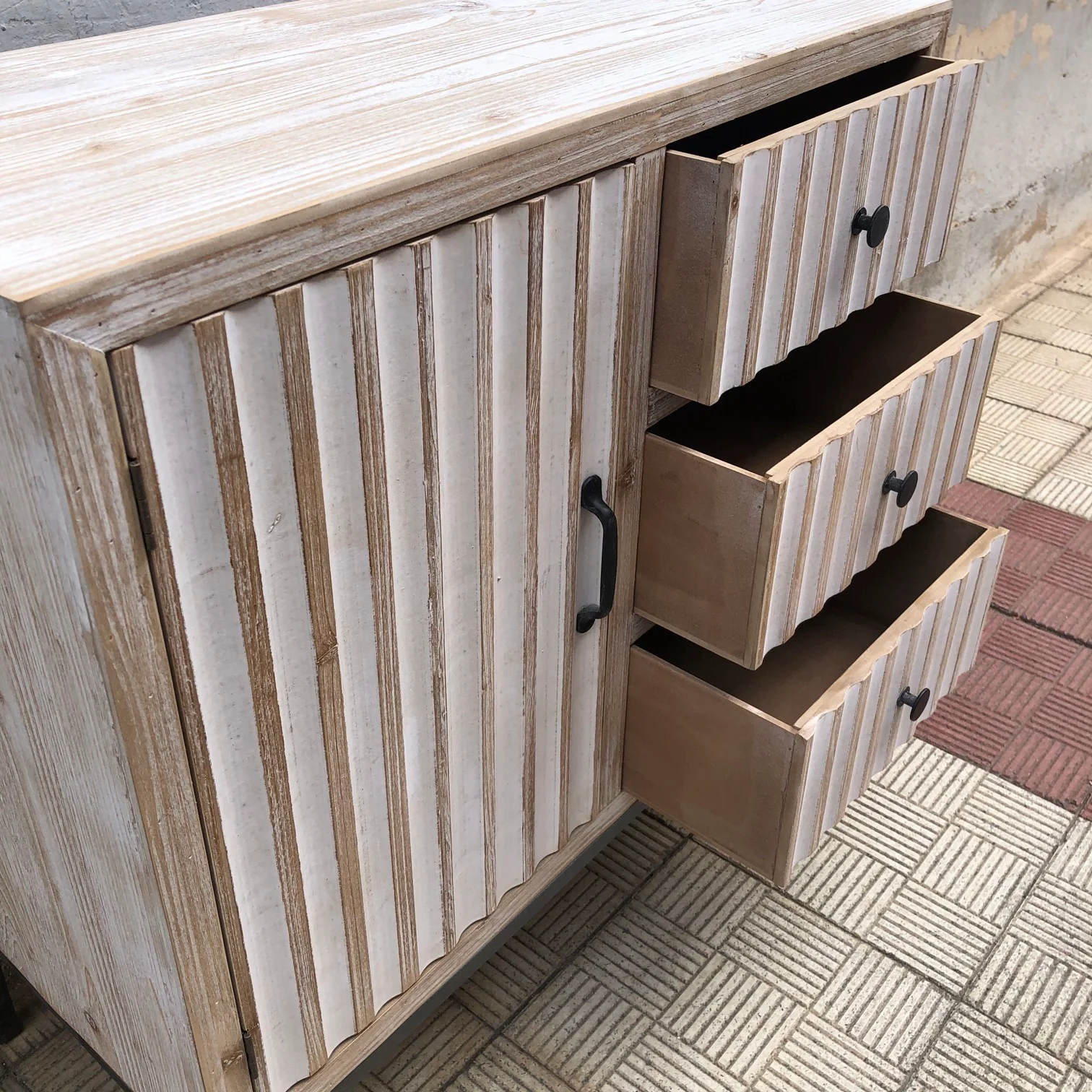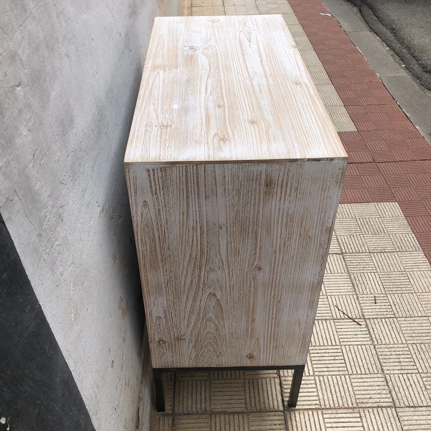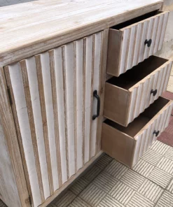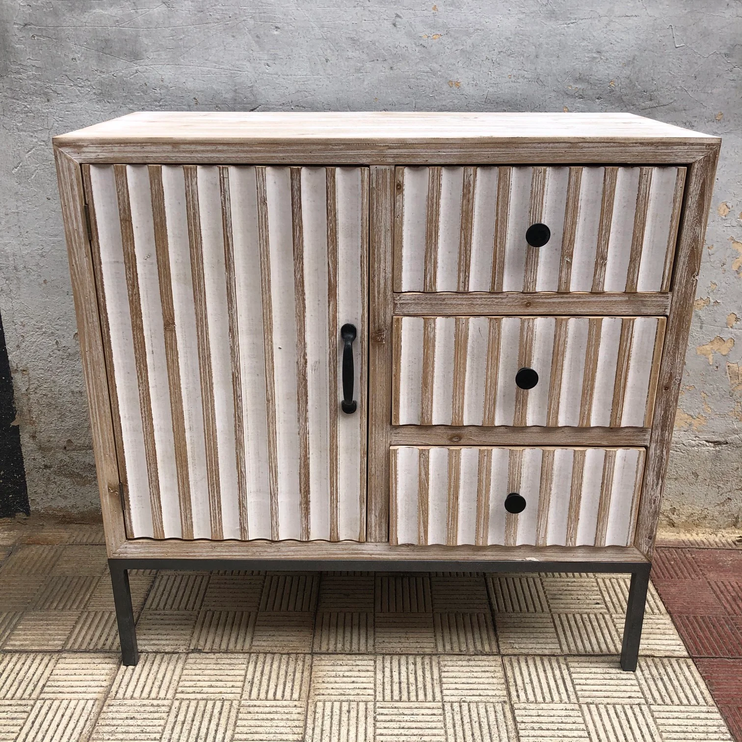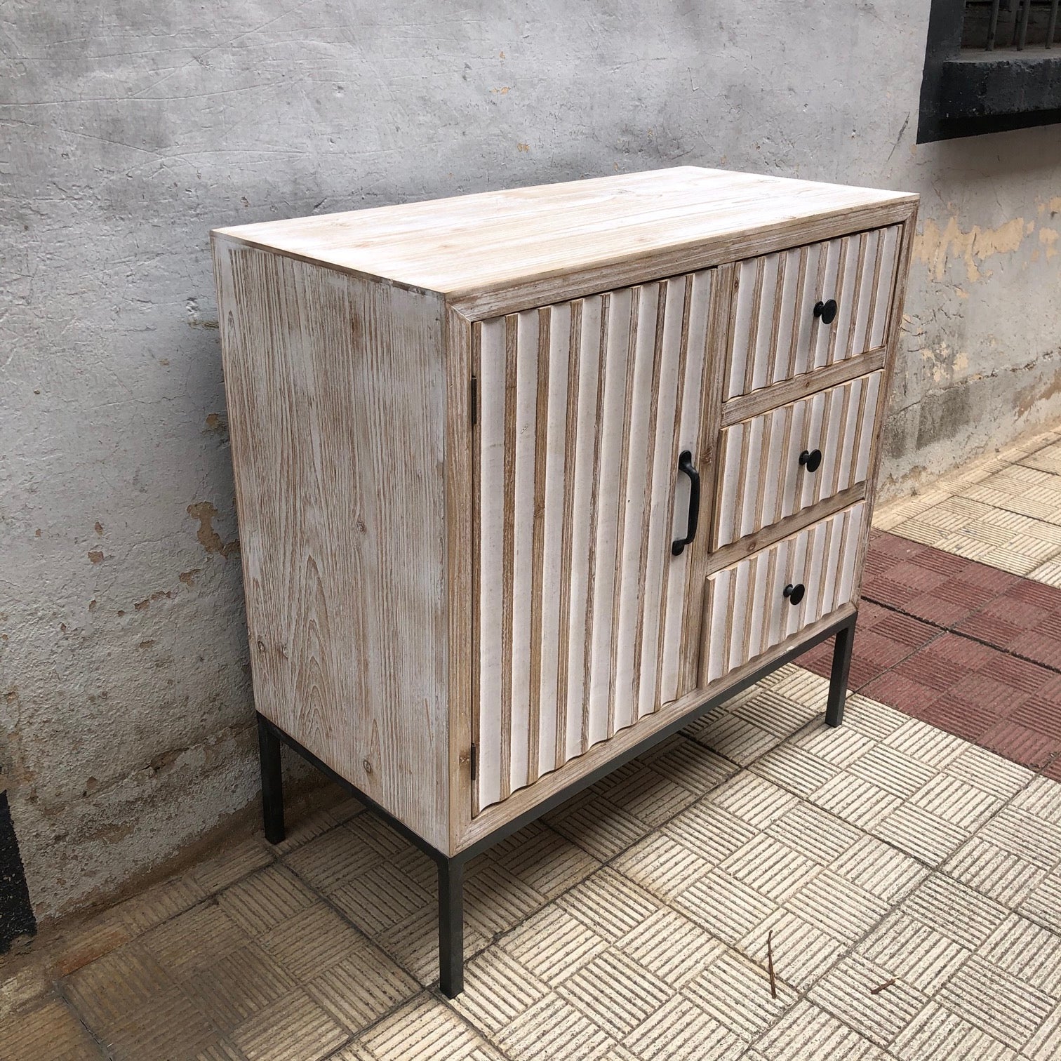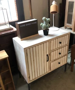 uDESCRIPCION: comoda con tres cajones y puerta de madera. Estructura y patas metálicas