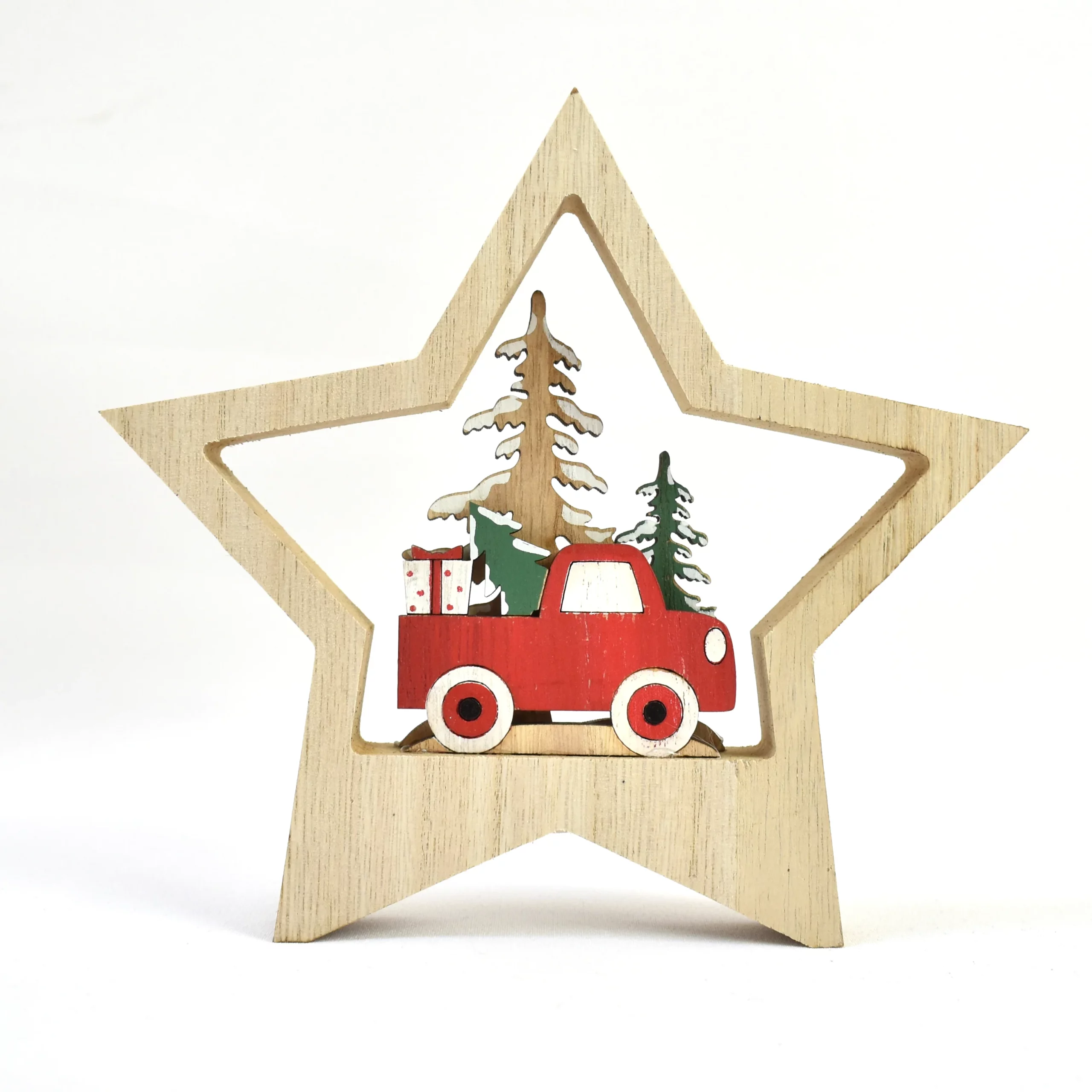Pieza de madera con forma de estrella, en el interior tiene una bonita estampa navideña también en madera.