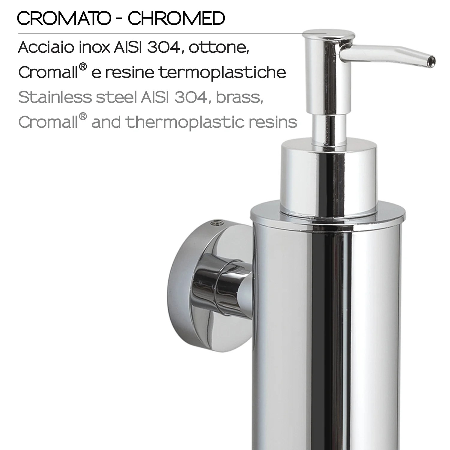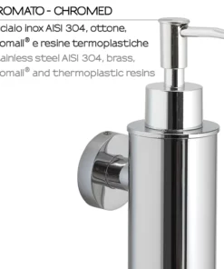 Dosificador Jabón 150ML Cromo de la serie SEAL fabricado por Gedy en Italia. Acabado color cromo. Fabricado en acero inox aisi 304 y latón y cromall y resinas termoplásticas. Capacidad de 150 ml.