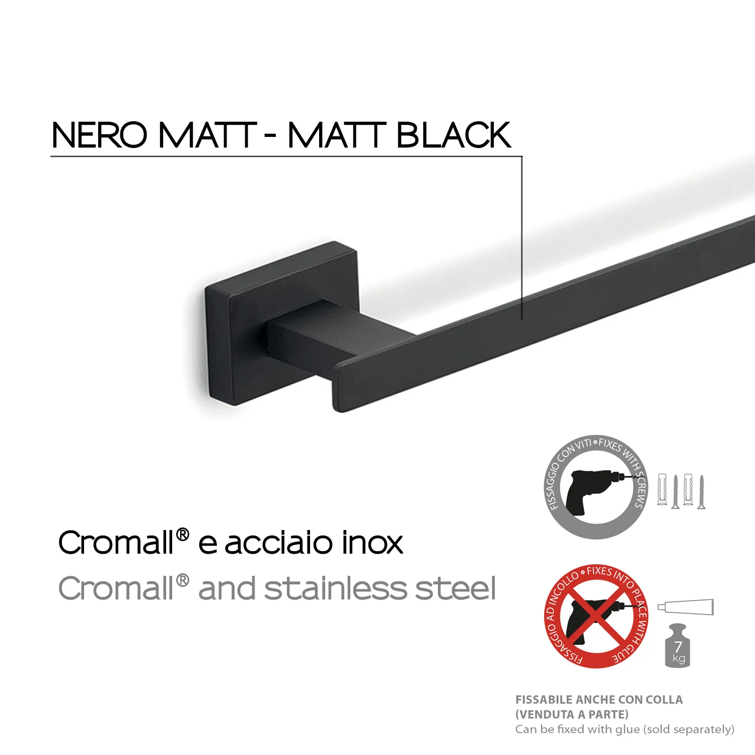 Toallero 35CM Negro Mate de la serie ATENA fabricado por Gedy en Italia. Acabado color negro mate. Fabricado en acero inox y cromall. Posibilidad de fijación con cola no incluida.
