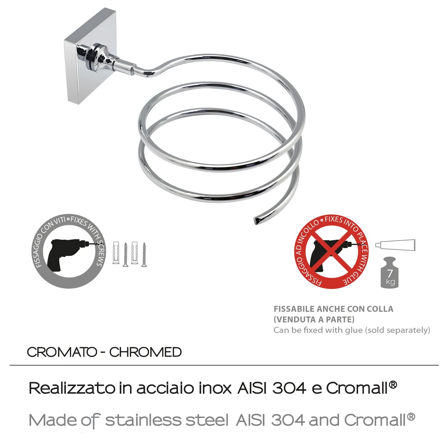 Soporte Para Secador Cromo de la serie FUJI fabricado por Gedy en Italia. Acabado color cromo. Fabricado en acero inox aisi 304 y cromall. Posibilidad de fijación con cola no incluida