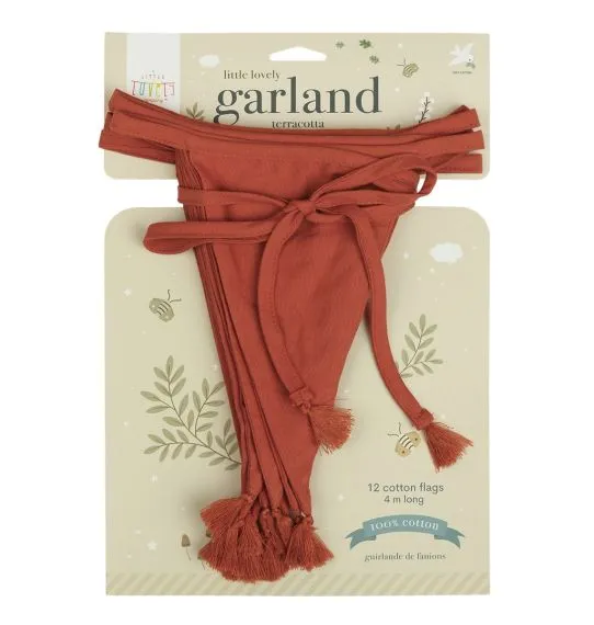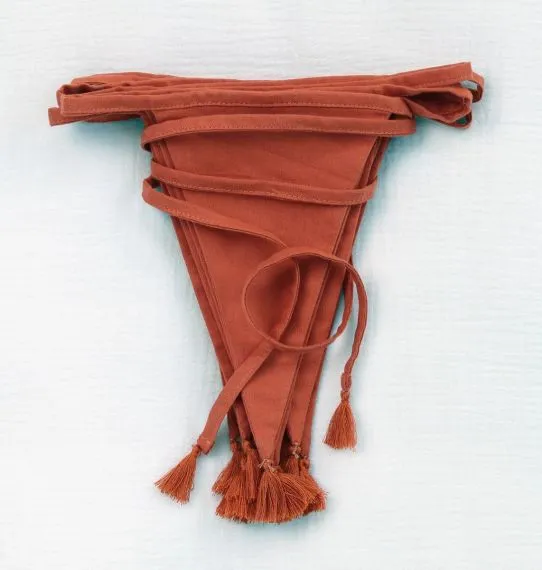 Dale un toque de color a la decoración de una habitación o a tu fiesta con esta bonita guirnalda de tela color terracota con flecos a juego en las puntas. Mide 4 metros de largo y está confeccionada a mano y realizada con algodón 100% de origen sostenible. Conseguirás un toque muy boho y podrás reutilizarla tantas veces como quieras.