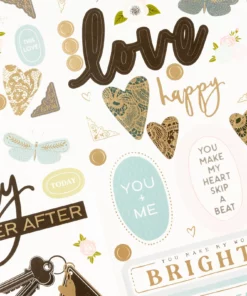 Hoja de pegatinas con 109 iconos, algunos on detalle de foil dorado, que combinan con el resto de la colección. Perfectos para tus trabajos de scrapbooking y manualidades.