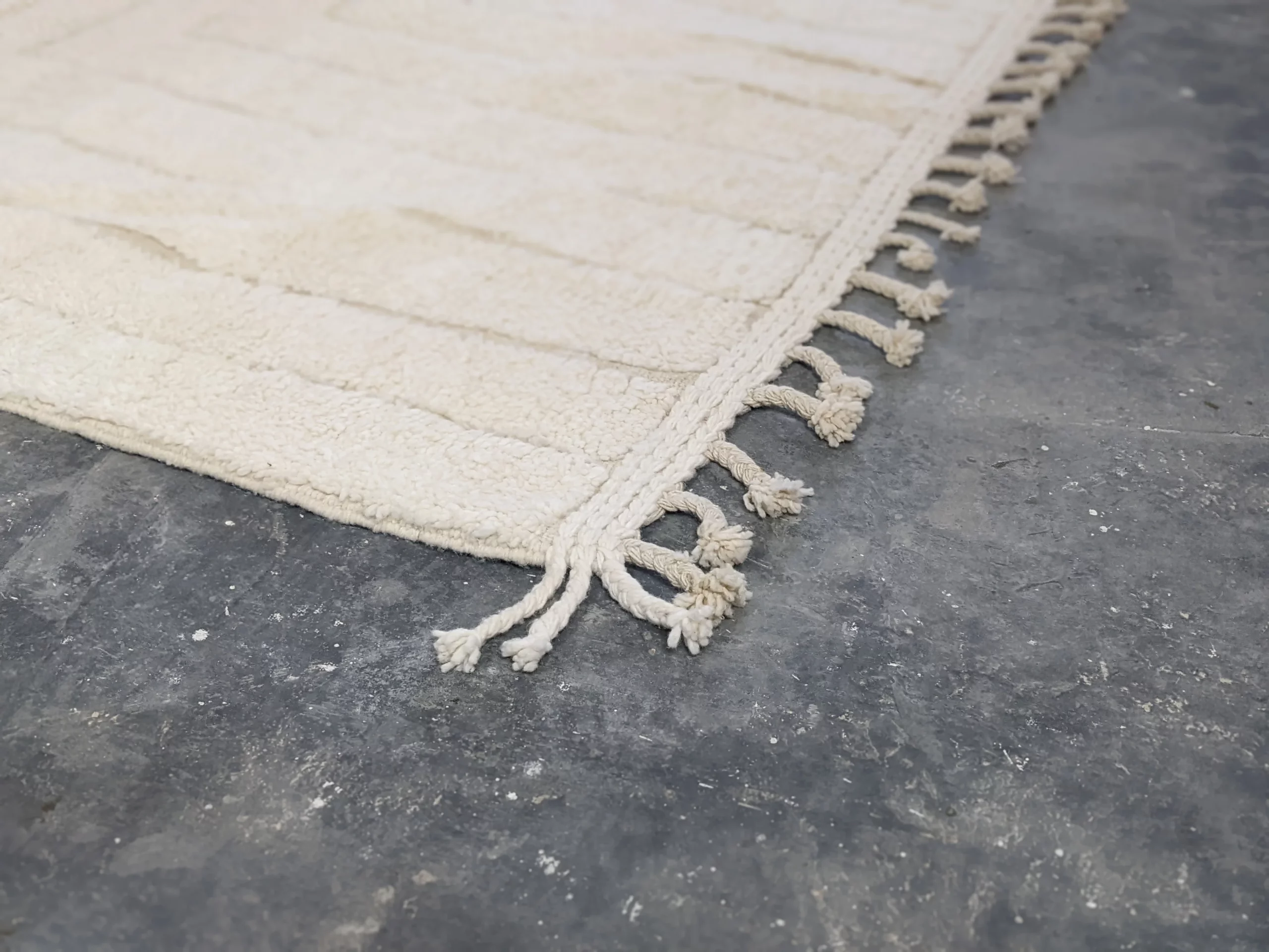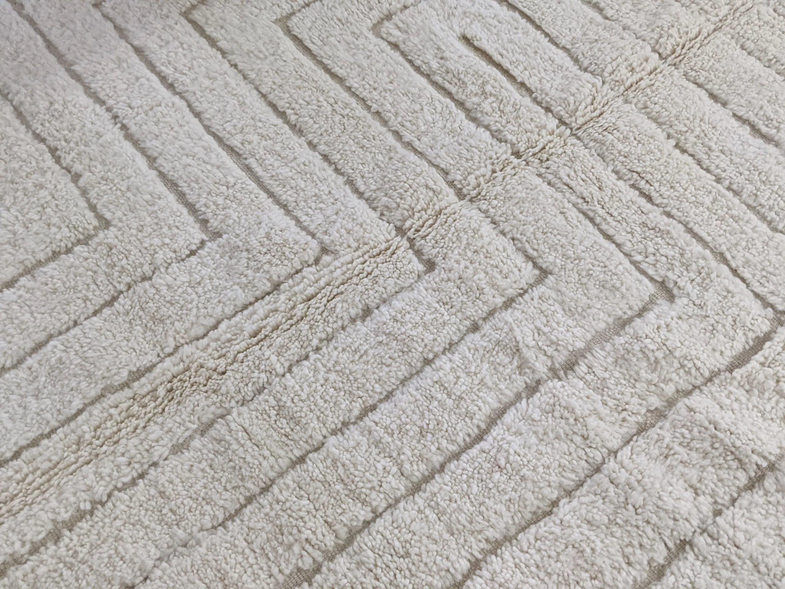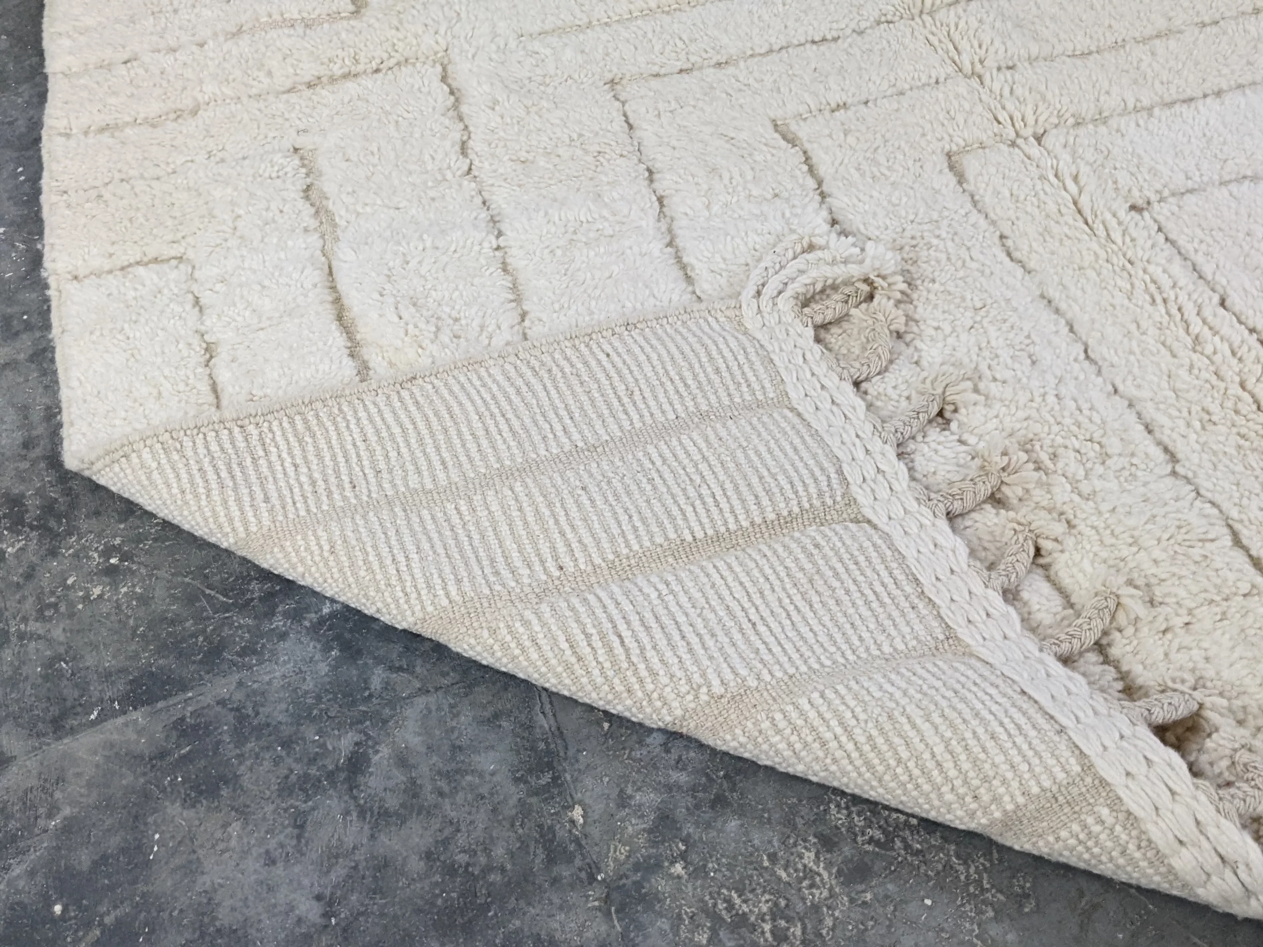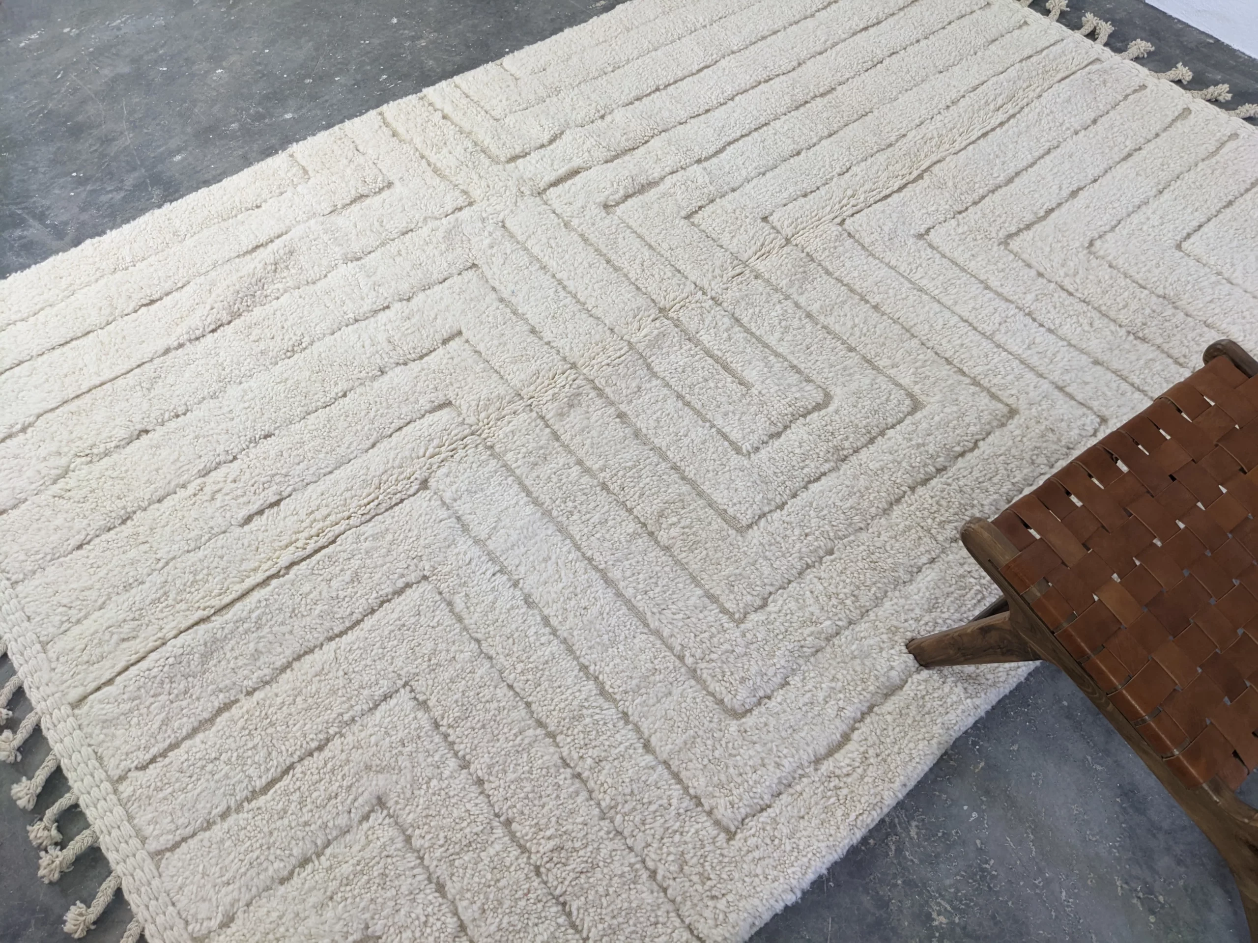 Bring a touch of minimalist elegance to your space with this handcrafted Beni Ouarain rug. The soft, textured grooves create an intricate labyrinth-like pattern, with each line representing the skilled craftsmanship of Berber artisans. These grooves, or ‘surcos,’ are deeply woven into the rug, giving it a subtle yet captivating design that complements any modern or traditional decor.
