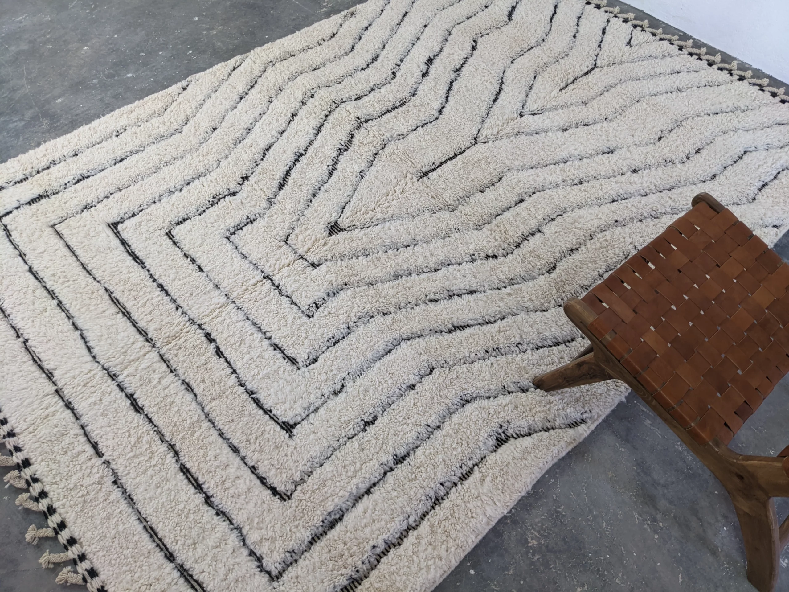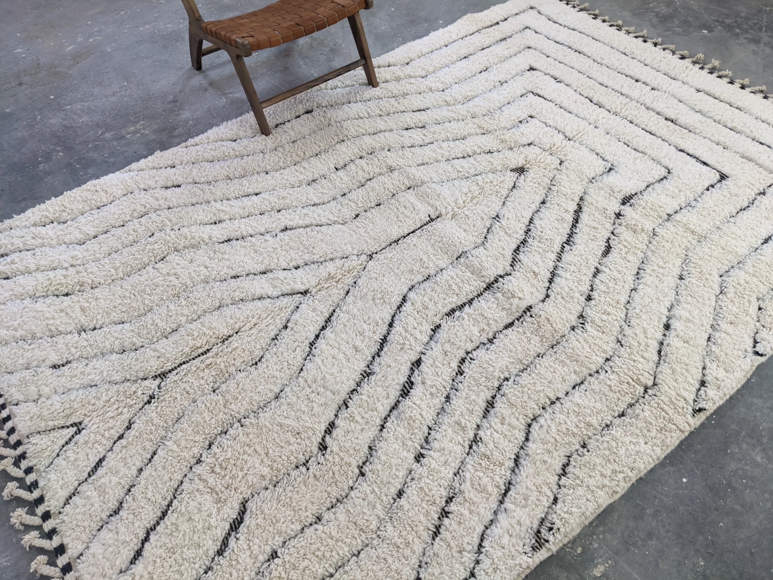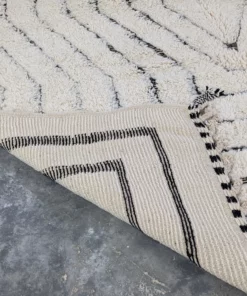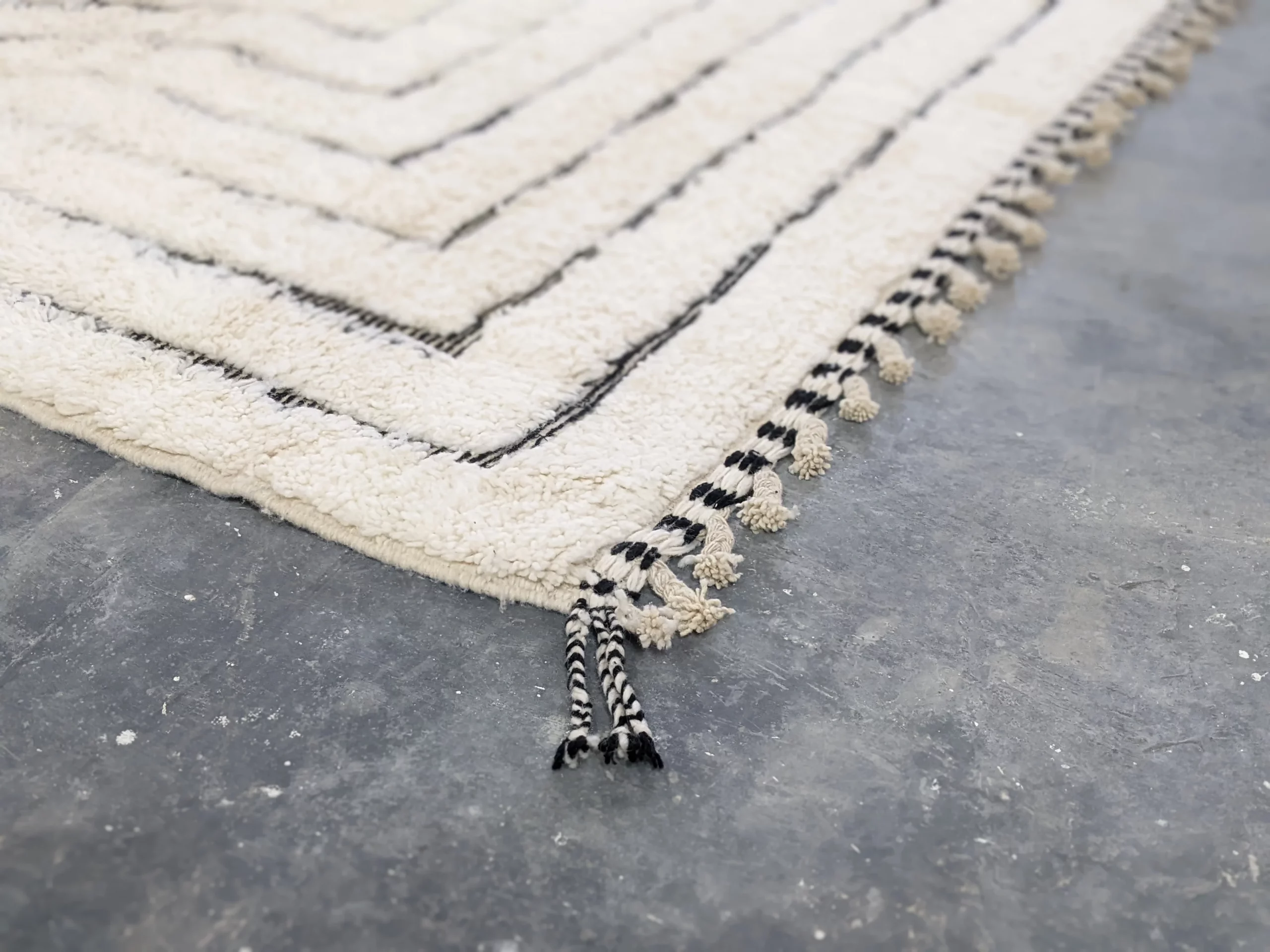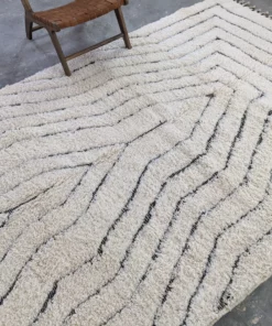 Step into the world of traditional Berber artistry with this unique Beni Ouarain rug. Handwoven by skilled artisans in Morocco, this piece is made from 100% organic sheep’s wool, ensuring both luxurious softness and durability. The intricate black geometric lines form a striking yet harmonious pattern that draws the eye, reflecting the timeless beauty and symbolism of Berber culture.