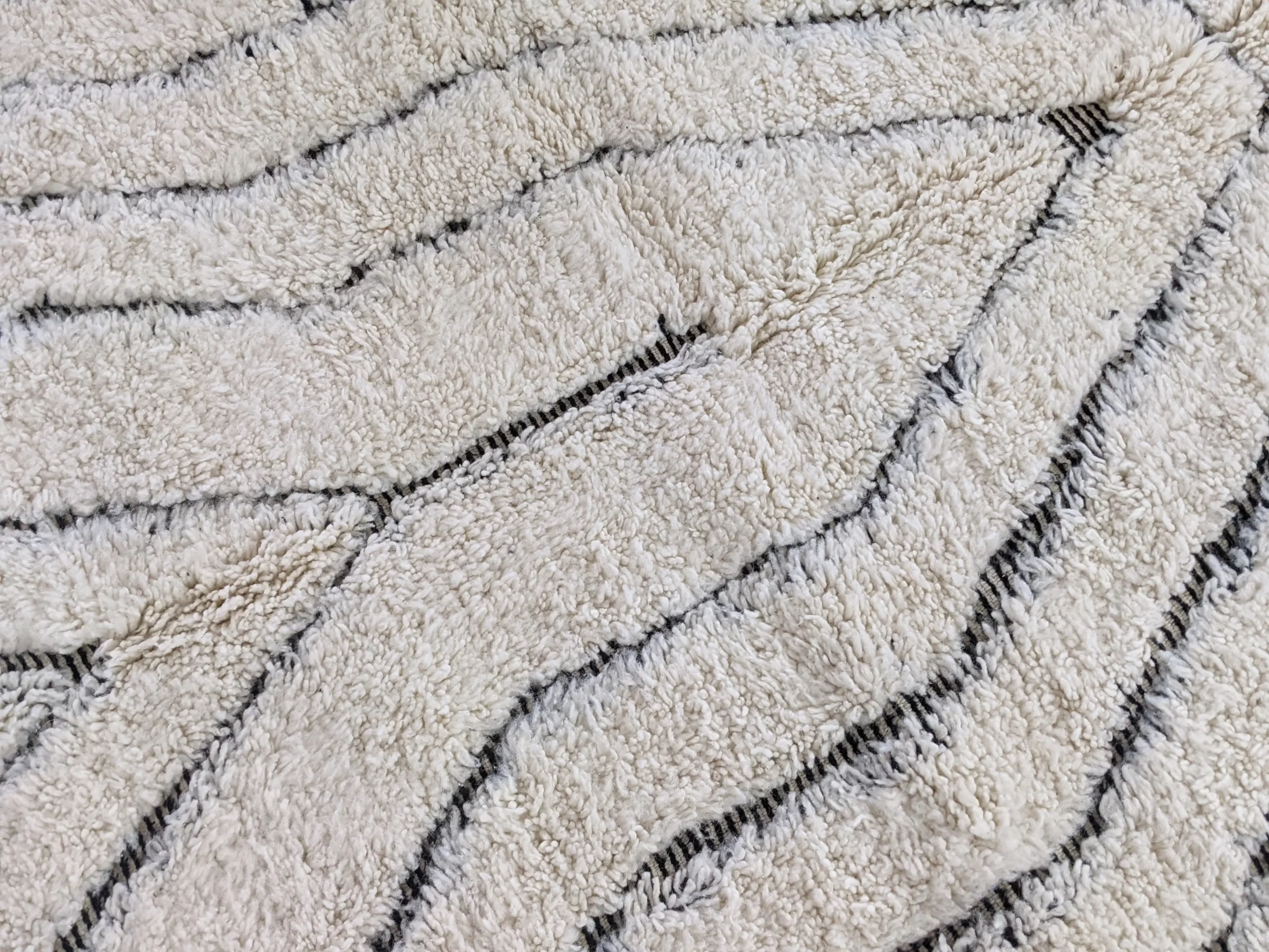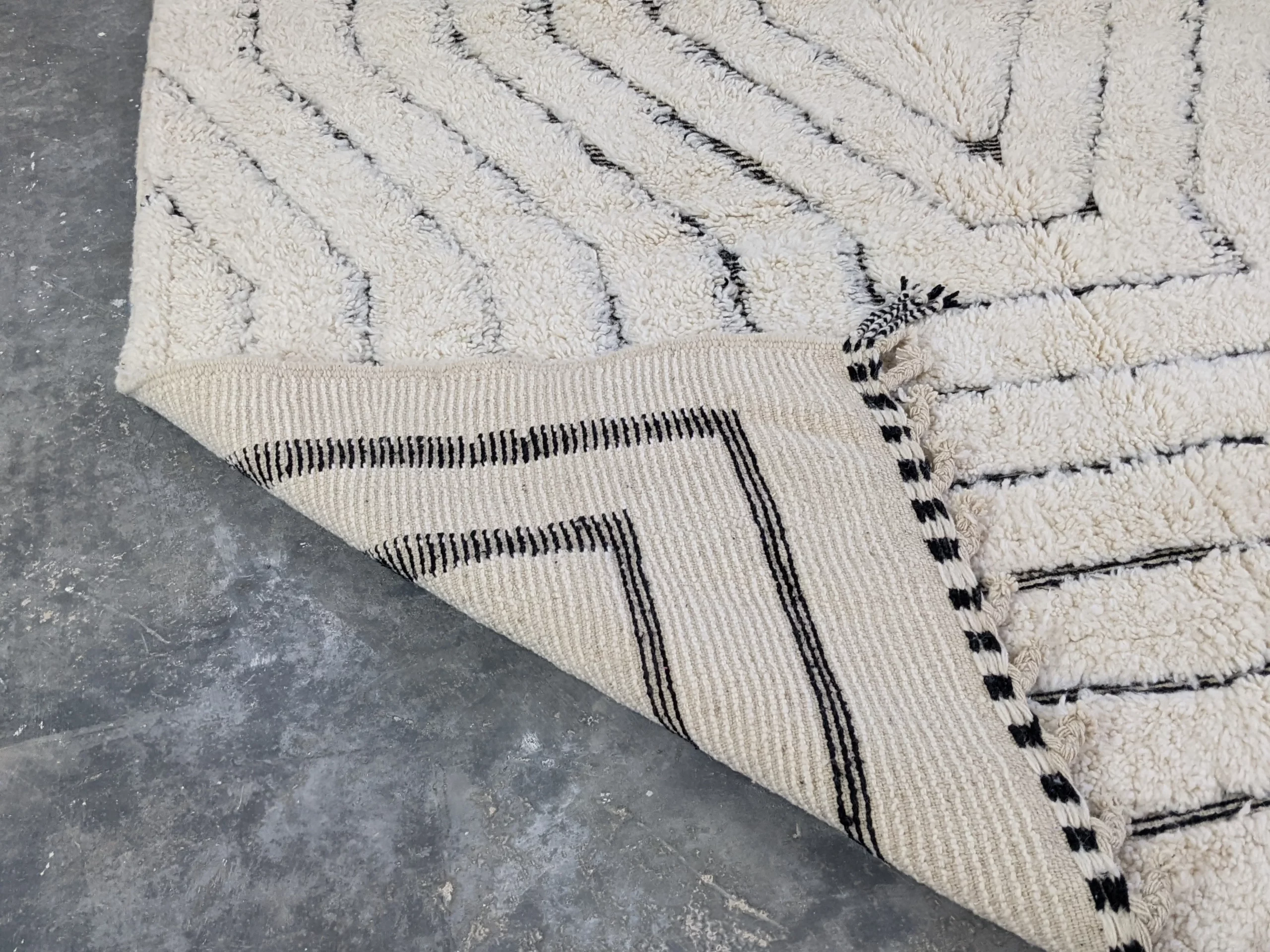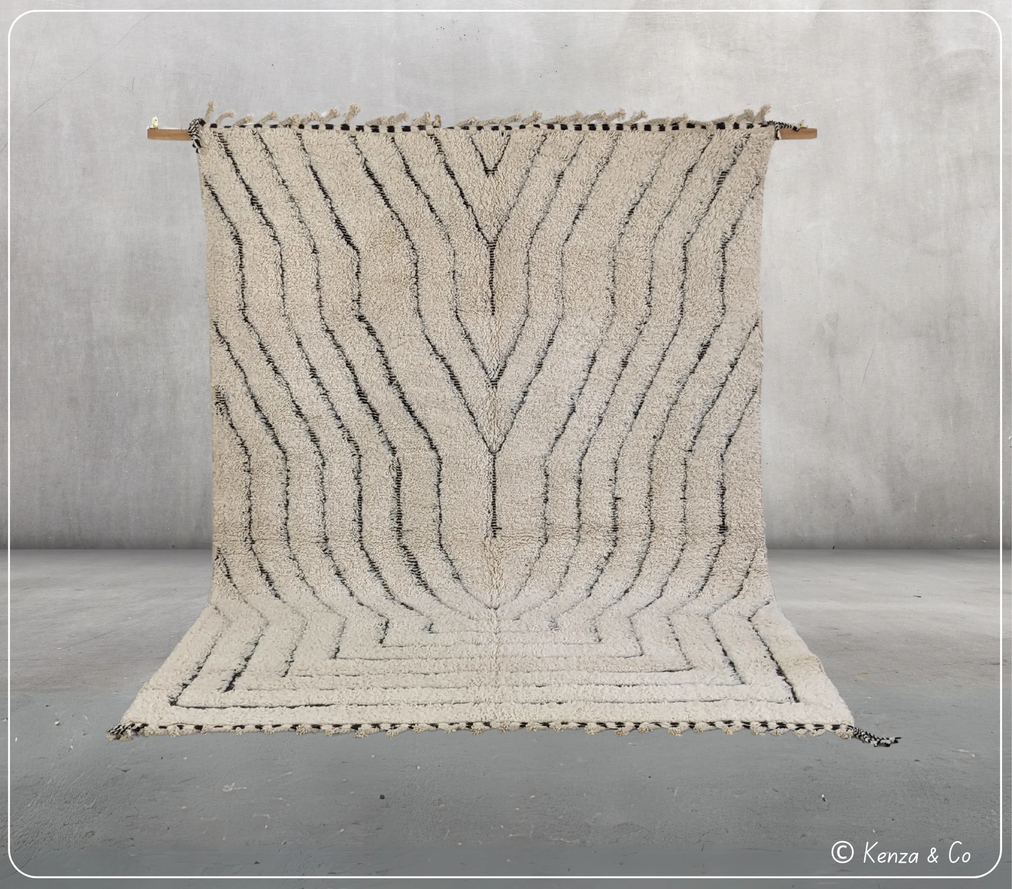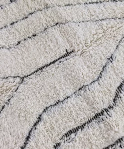 Step into the world of traditional Berber artistry with this unique Beni Ouarain rug. Handwoven by skilled artisans in Morocco, this piece is made from 100% organic sheep’s wool, ensuring both luxurious softness and durability. The intricate black geometric lines form a striking yet harmonious pattern that draws the eye, reflecting the timeless beauty and symbolism of Berber culture.