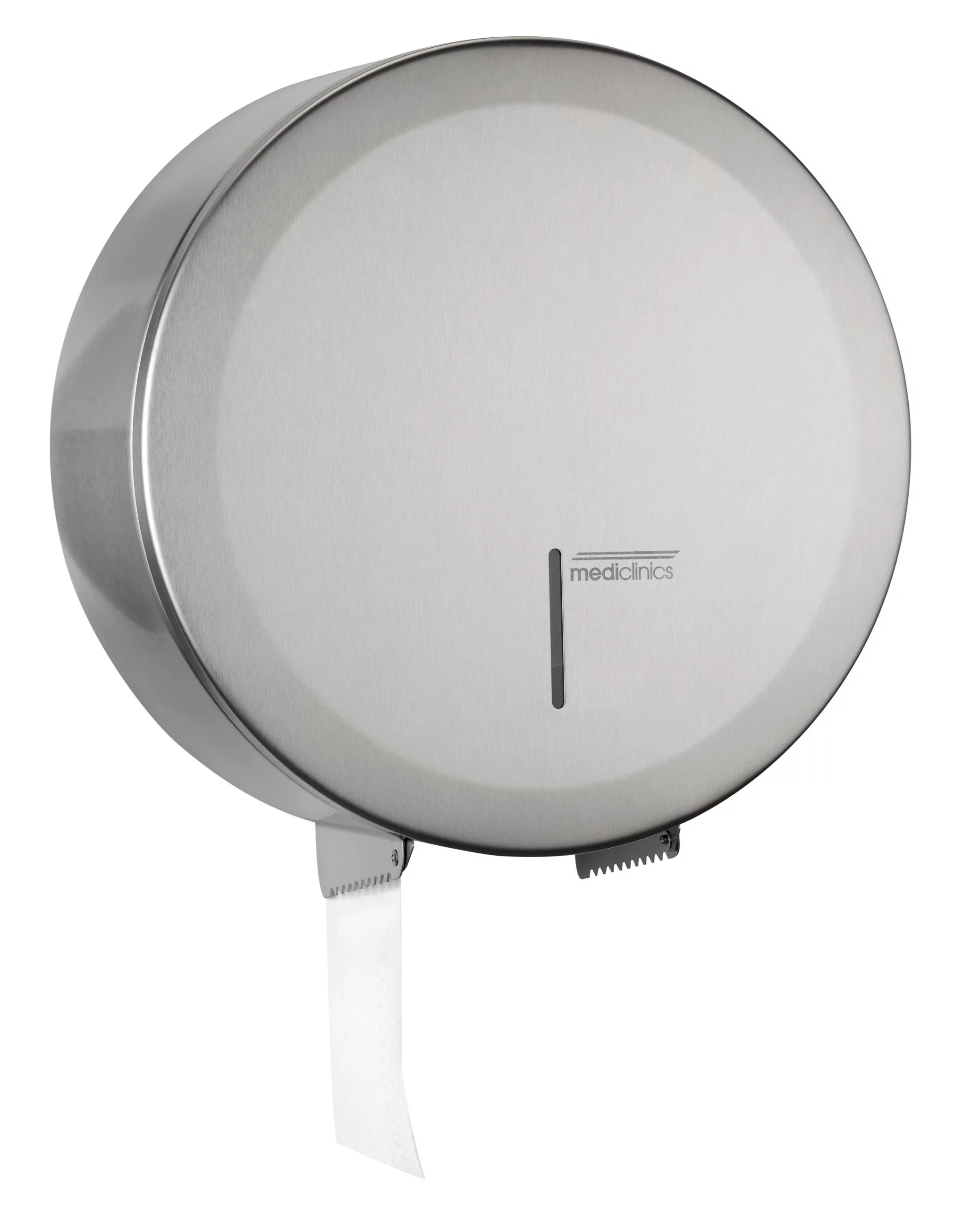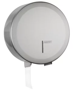 Dispensador de papel higiénico circular manual para adosar a la pared PR2787CS de Mediclinics, apto para rollo industrial. Admite rollos de papel de diámetro máximo 274 mm. Diseño actual y de vanguardia, concebido para tener una larga vida útil y ser anti-vandálico. Fabricado en acero inoxidable AISI 304 acabado satinado.