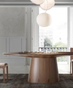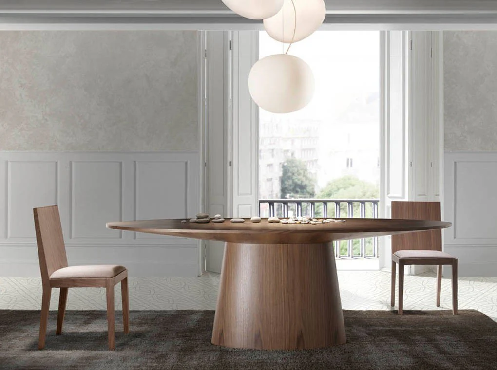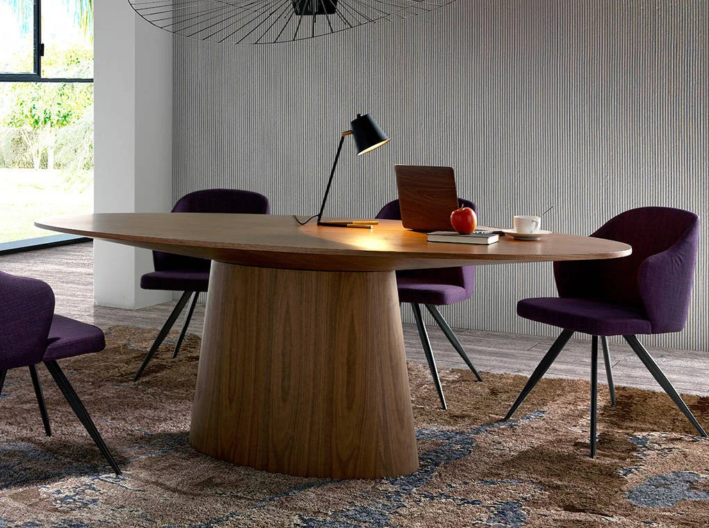Original mesa de comedor de forma ovalada que podrás tener en madera chapada en nogal.