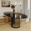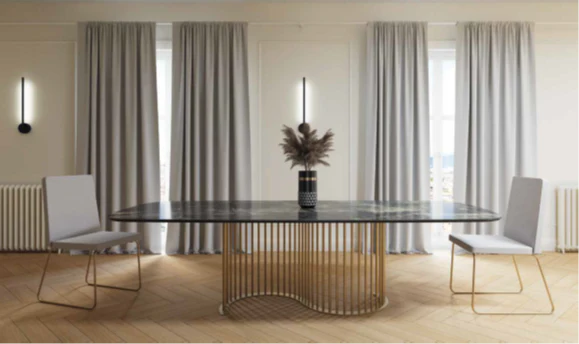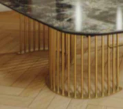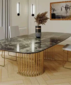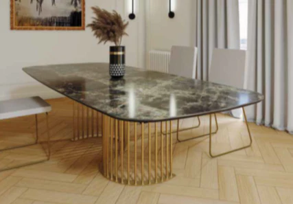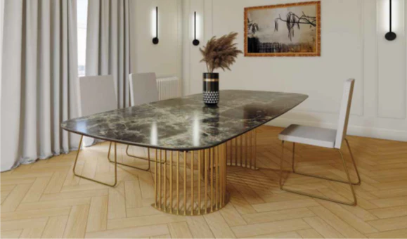 Mesa comedor de diseño modelo NILO con tapa porcelánico acabado amazónico brillo, pie acabado oro mate.