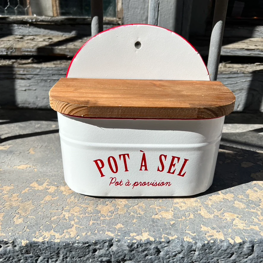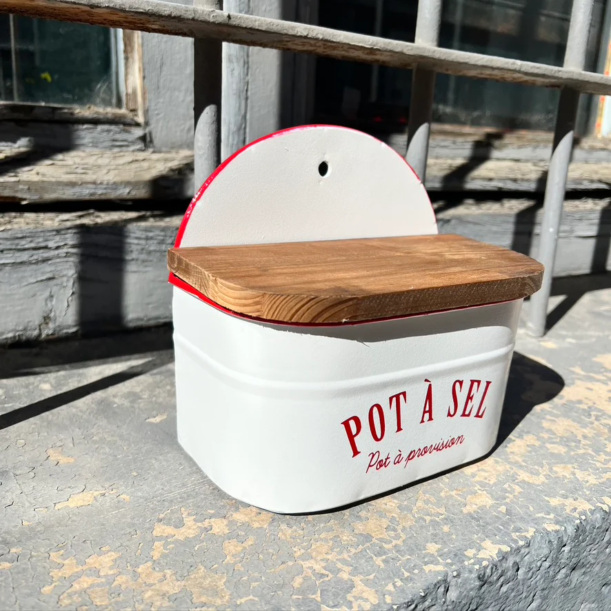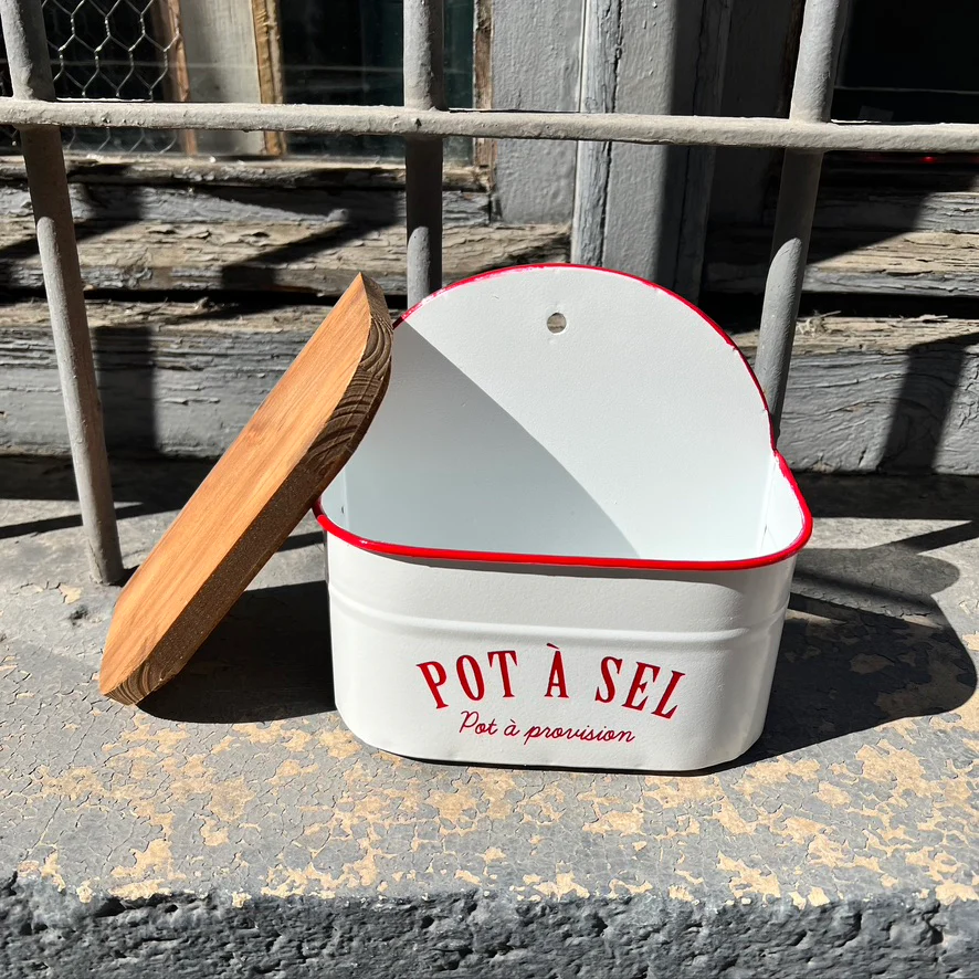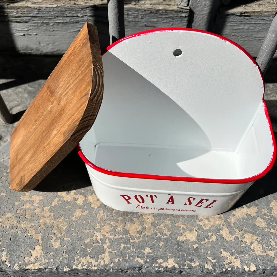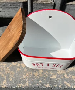 DESCRIPCION: recipiente metálico con decoración en rojo para hacer las funciones de salero. Tapa de madera