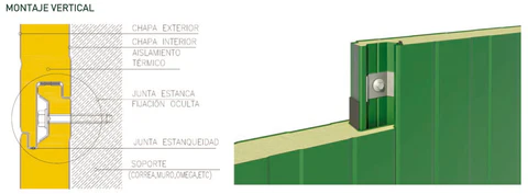 La junta mediante el machihembrado es una operación sencilla y segura. Se realiza tanto en vertical o en vertical con tornillería de fijación oculta. A continuación mostramos un esquema del montaje correcto de estos paneles de fachada.